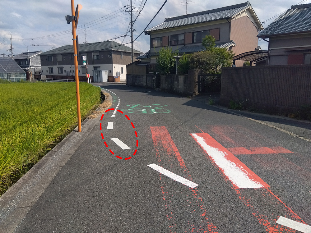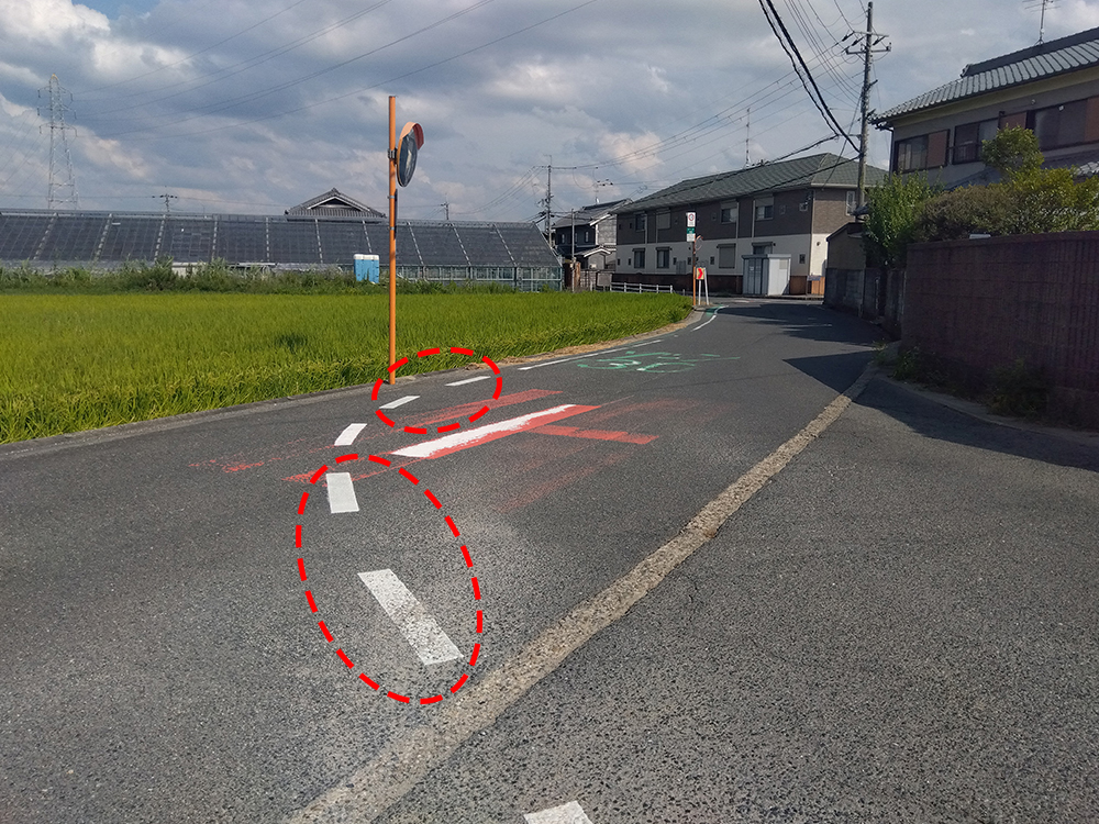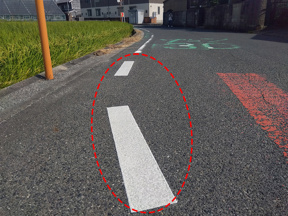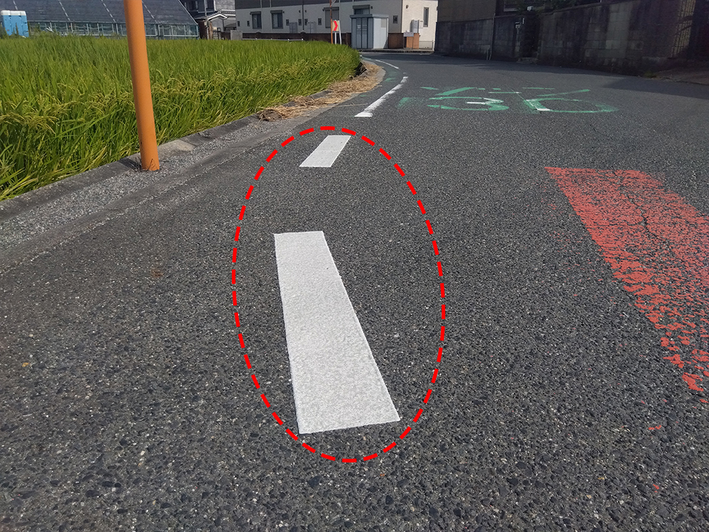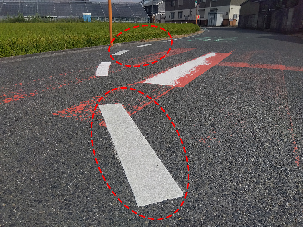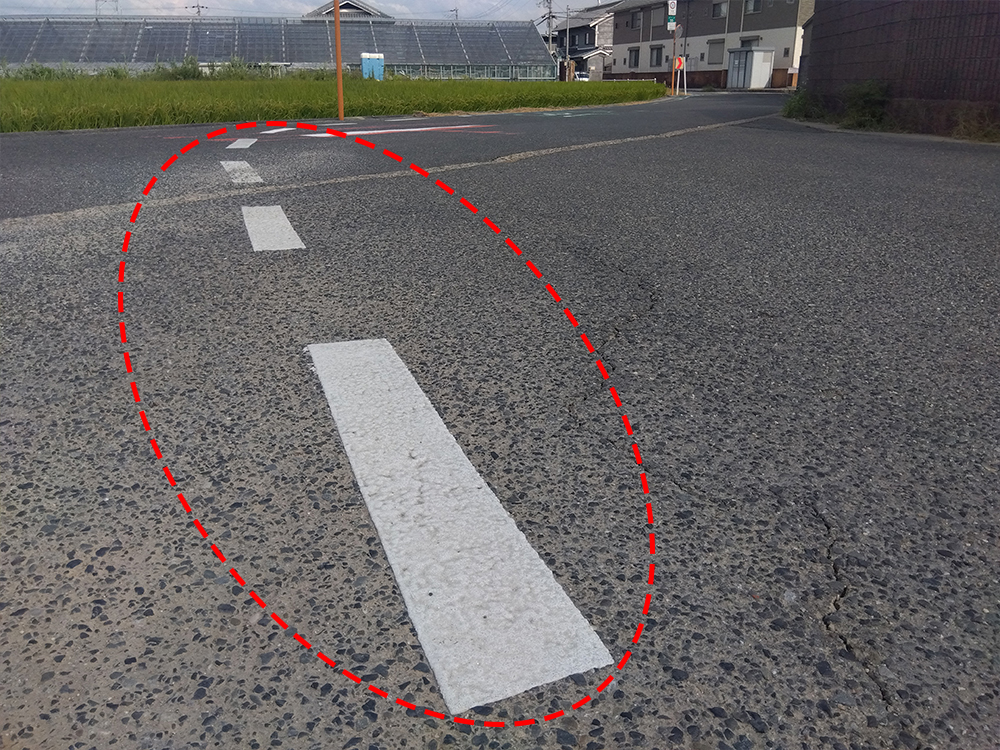 交差点部の白線が薄くなっている箇所の補修に施工されました。
