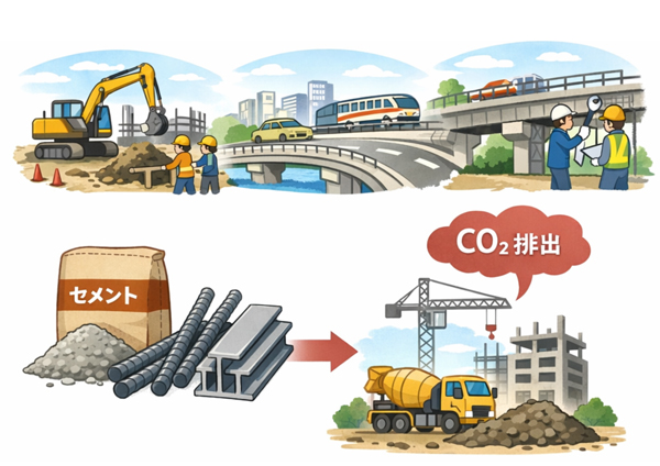 特にインフラ整備では、施工時に使用される建設機械だけでなく、コンクリートや鋼材など材料製造段階で排出されるCO₂の削減が重要視されています。コンクリートは社会基盤に不可欠な材料である一方、セメント製造時のCO₂排出量が多いとされており、材料選択や配合設計、製造工程の見直しなど、多角的な取り組みが求められています。